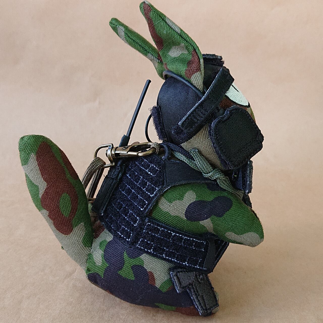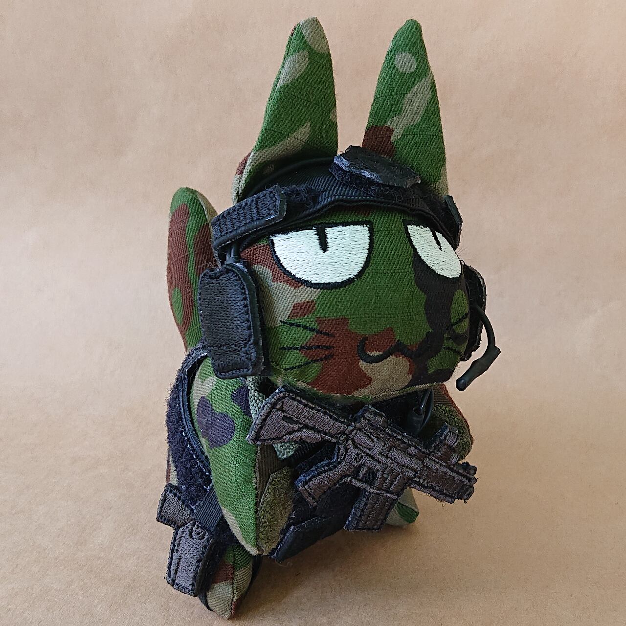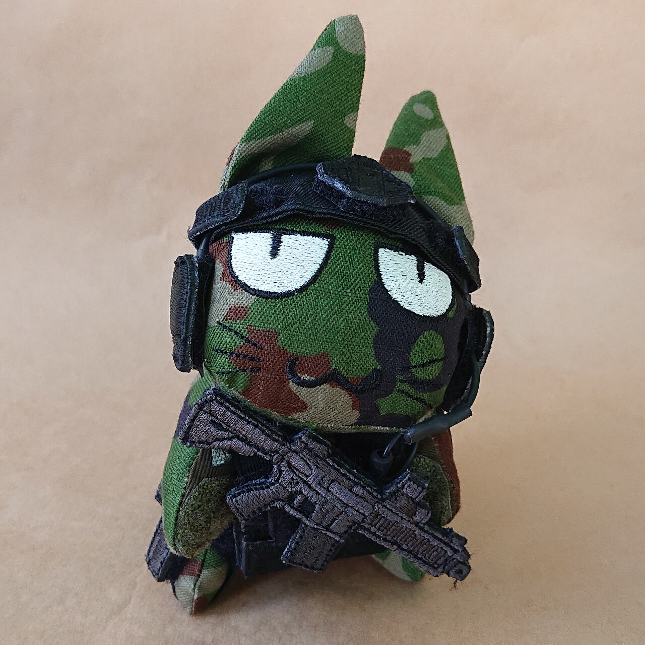 迷彩猫ぬいぐるみ「モソニャソ」の進化バージョン。刺繍ワッペン製作技術を応用して製作した各種武装を取り付けられる「武装モソニャソ」の特殊部隊員風装備セットです。