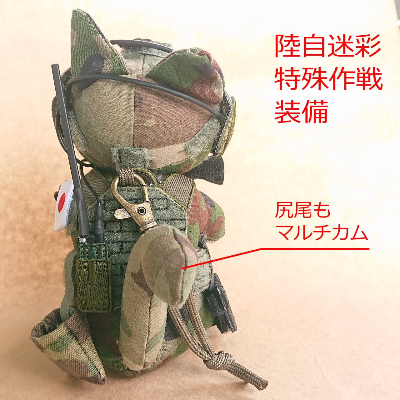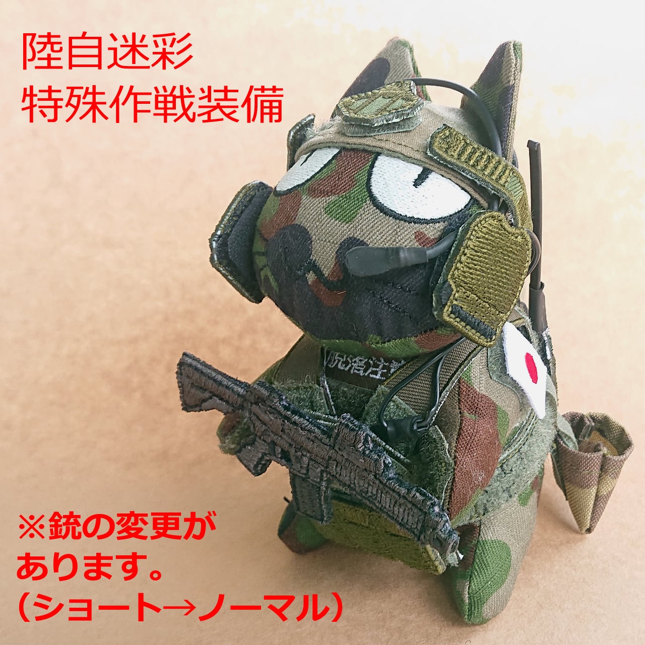 迷彩猫ぬいぐるみ「モソニャソ」の進化バージョン。刺繍ワッペン製作技術を応用して製作した各種武装を取り付けられる「武装モソニャソ」の特殊部隊員風装備セットです。