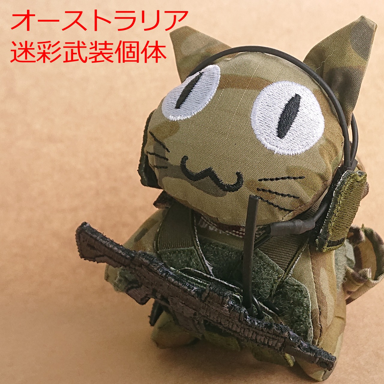 迷彩猫ぬいぐるみ「モソニャソ」の進化バージョン。刺繍ワッペン製作技術を応用して製作した各種武装を取り付けられる「武装モソニャソ」の特殊部隊員風装備セットです。